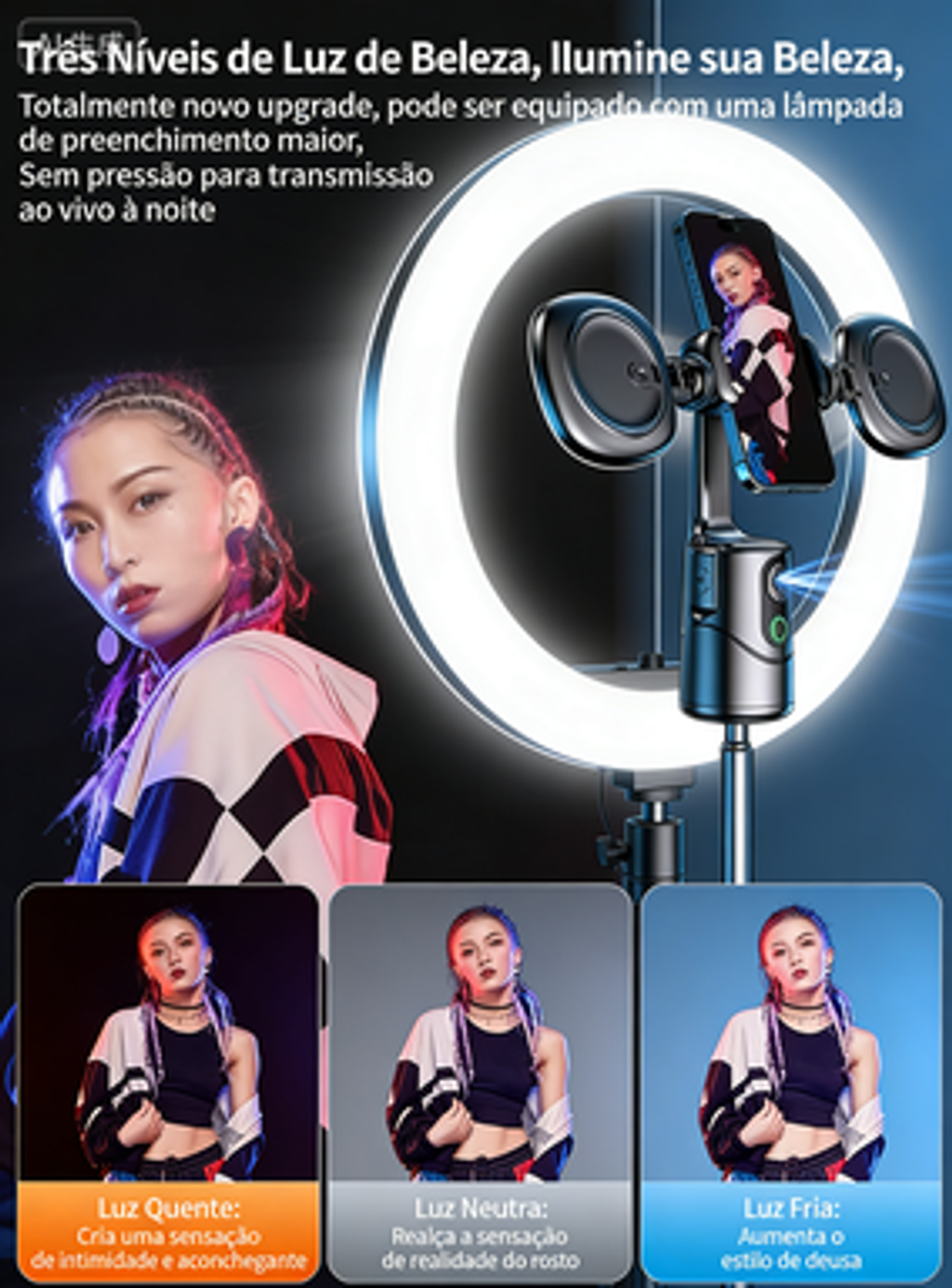 Iluminação ajustável para realçar sua beleza, ideal para gravações de maquiagem, vlogs e transmissões ao vivo.